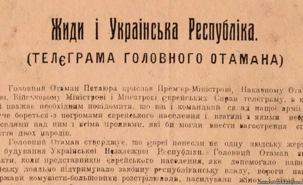 Повідомлення про телеграму головного отамана військ УНР Симона Петлюри, датованої липнем 1919 року про те, що керівництво української армії веде рішучу боротьбу з тими, хто вчиняє погроми проти єврейського населення. Йдеться, зокрема, про необхідність «безпощадної боротьби» із більшовицькими провокаторами, які вдаються до «погромної агітації». ЩОБ ПРОЧИТАТИ текст цього артефакту, у вигляді листівки (29×40,5 см.), виданої Міністерством преси УНР, відкрийте її у великому форматі, натиснувши на зображення.