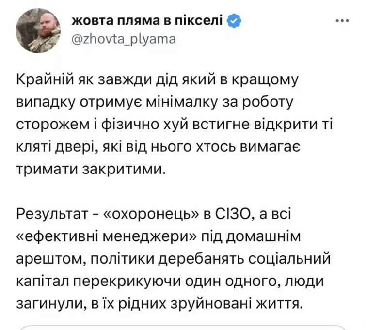 У Twitter військовий ТрО ЗСУ під назвою “жовта пляма в пікселі” написав: “Крайній як завжди дід який в кращому випадку отримує мінімалку за роботу сторожем і фізично х*й встигне відкрити ті кляті двері, які від нього хтось вимагає тримати закритими”.