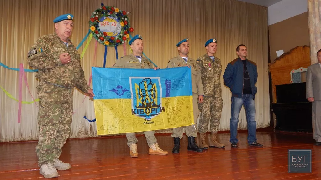 “Ось тут на прапорі ми написали імена всіх хлопців, котрі загинули обороняючи всім відому “вишку”. Ми їх не забудемо! Знаємо, що серед вас є учні, чиї батькі наразі знаходяться в зоні бойових дій і потрібно такими людьми гордитися. На сьогодні, ваше головне завдання добре вчитися, а потім бути патріотом своєї держави” – зазначив кіборг Юрій Хомич.