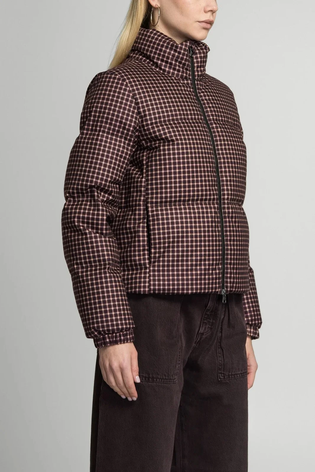 Яскравий приклад класичного пуховика – Printed Wool Jacket від Woolrich. Характерний дрібний принт у стилі checked pattern створює магію: тепла жіноча куртка виглядає не масивно, а структуровано. Короткий силует створює збалансовану пропорцію зі штанами прямого або широкого крою, не перевантажує образ і забезпечує свободу рухів у місті.