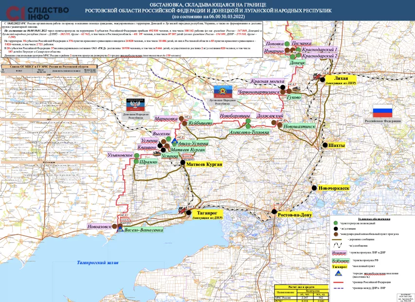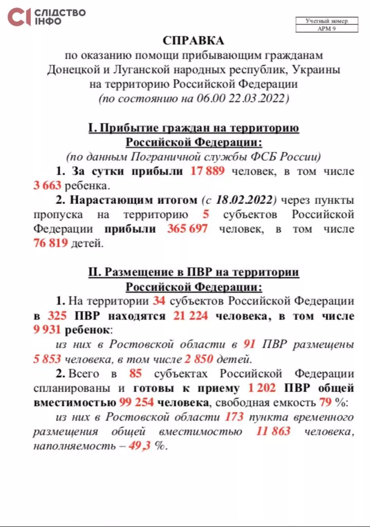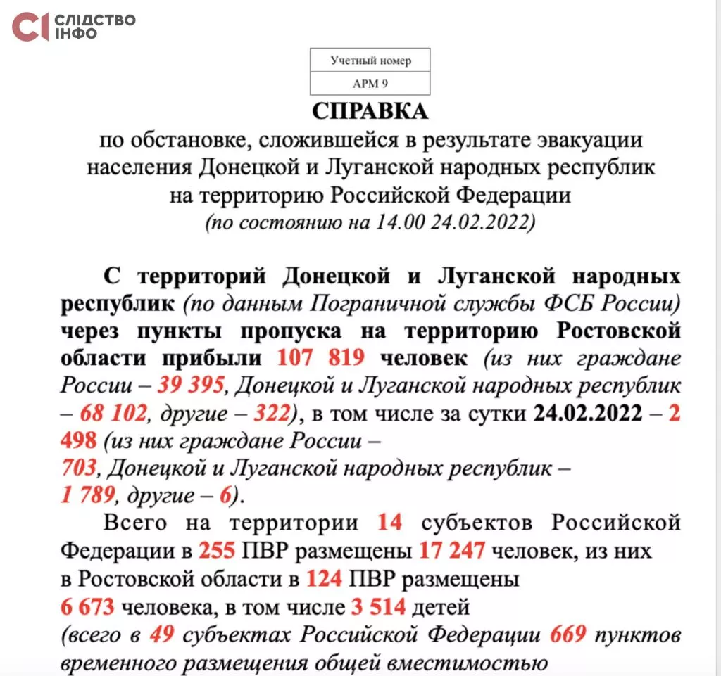 У першому листі зазначається, що 24-го лютого з територій ОРДЛО через пункти пропуску на територію Ростовської області прибуло 107 819 осіб.