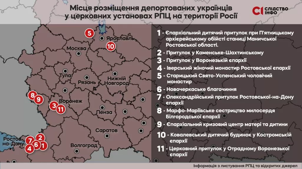 «Слідство.Інфо» з’ясувало, що одну з ключових ролей у депортації та розселенні українців посідає Російська православна церква. Міністерство надзвичайних ситуацій росії передає церковникам інформацію про депортованих, а вони вже централізовано розселяють їх по церквах та монастирях. Журналісти визначили розташування церковних закладів, де можуть перебувати насильно вивезені українці.