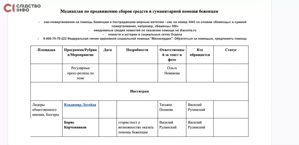 Попри те, що РПЦ приховує шляхи доставки українців до своїх церковних закладів, умови їхнього утримання, а тим більше інформацію про камери спостереження за насильно вивезеними людьми, водночас церковники розгорнули цілу інформаційну кампанію з поширення відомостей про свою благодійність. Серед листів ми знайшли підготований церковниками медіаплан поширення своїх меседжів із залученням російських блогерів та новинних медіа.