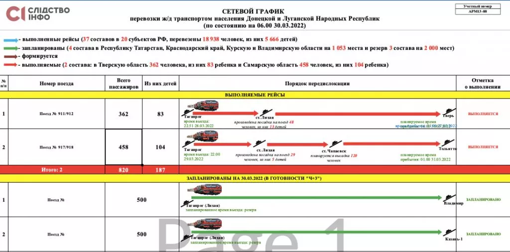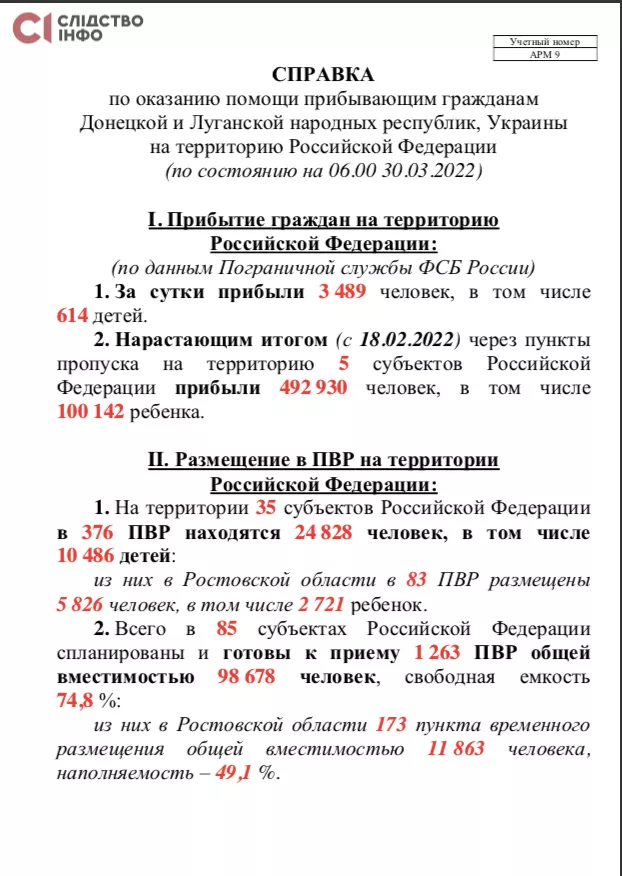 Кількість вивезених до росії українців зростає кожного дня. У останньому листі від 30-го березня, який є у розпорядженні «Слідства.Інфо», зазначається, що за весь час депортації до росії прибули майже 490 тисяч людей, серед яких 100 тисяч — діти. Таку ж кількість насильно вивезених до росії українців у своїх заявах тими днями називала українська омбудсменка Людмила Денисова.