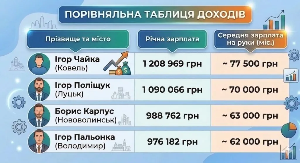 Лідером за рівнем оплати праці став мер Ковеля, чий дохід відчутно випереджає колег з Нововолинська та Володимира. Важливо розуміти, що «гола» ставка мера зазвичай є невисокою, а основну частину задекларованих сум складають надбавки за вислугу років, високі досягнення у праці та щомісячні премії, розмір яких затверджують депутати на сесіях.