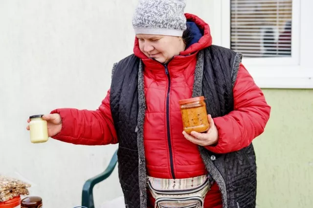 Пані Оля продає закрутки грибів, джемів, перетерту обліпиху до чаю, яблука і сушені фрукти. Каже, що туристів в листопаді вже нема і найбільше питання у селі: чи приїде хтось наступного року, якщо вода до озера не повернеться.