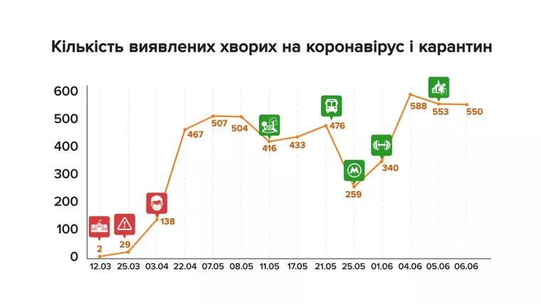 Так було і раніше. Наприклад, 11 травня за добу виявили 416 випадків інфікування — тоді карантин послабили вперше. Відкрили салони краси, літні майданчики кафе, дозволили гуляти в парках. 22 травня, коли виявили 432 нових інфікованих, запрацював громадський транспорт, готелі, дозволили спортивні заходи для професійних спортсменів. Напередодні 25 травня захворіли за добу 406 людей, але в цей день відновили роботу метрополітену.