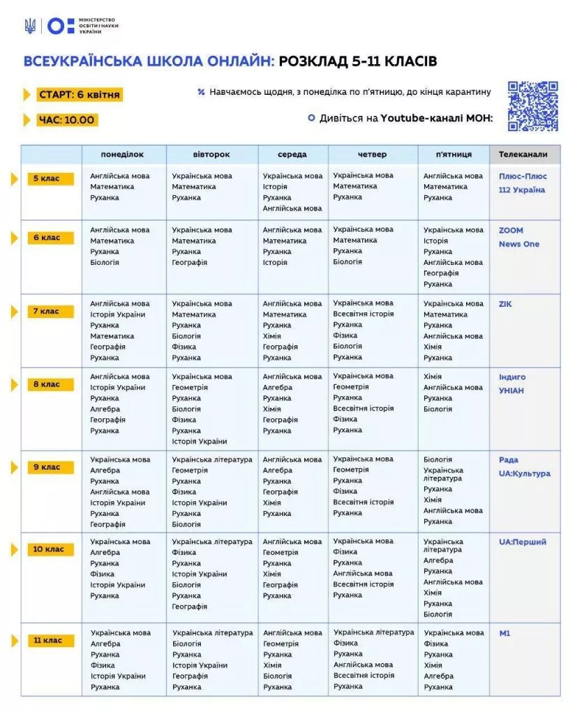 З 6-го квітня в Україні стартує проєкт “Всеукраїнська школа онлайн”. Учні 5-11 класів матимуть змогу переглядати уроки по телевізору або в інтернеті.