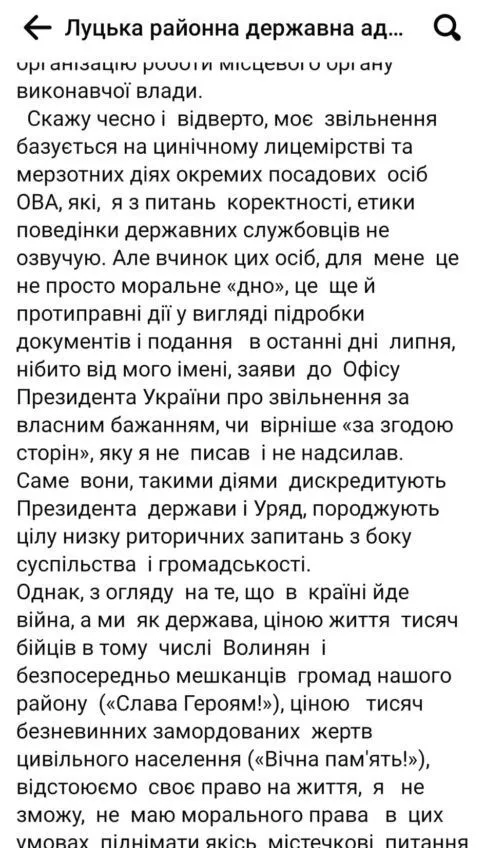 «…звільнення базується на цинічному лицемірстві та мерзотних діях окремих посадових осіб ОВА, які я, з питань коректності, етики поведінки державних службовців, не озвучую. Але вчинок цих осіб – це не просто моральне «дно», це ще й протиправні дії у вигляді підробки документів і подання в останні дні липня, нібито від мого імені, заяви до Офісу Президента України про звільнення за власним бажанням, чи, вірніше, «за згодою сторін», яку я не писав і не надсилав», — йдеться у заяві Кеца.