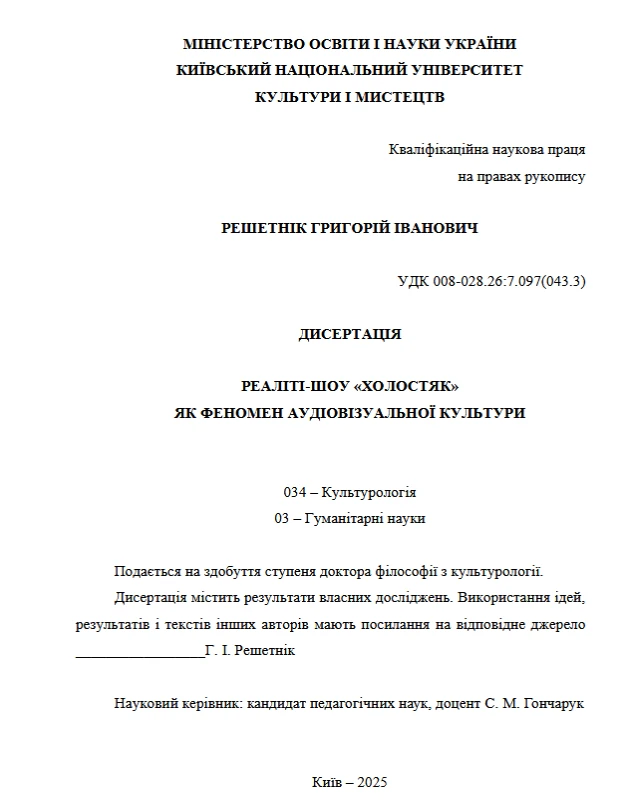 У своїй науковій роботі телеведучий проаналізував вплив телеформату на сприйняття кохання в сучасному суспільстві. Дисертація налічує 217 сторінок і складається з трьох розділів: реаліті-шоу як культурне явище, “Холостяк” як міжнародний проєкт та українська адаптація формату.