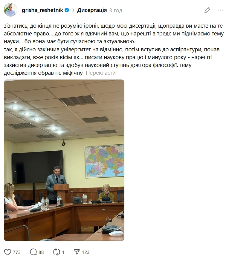 “Так, я дійсно закінчив університет на відмінно, потім вступив до аспірантури, почав викладати, вже років вісім як… писати наукову працю і минулого року – нарешті захистив дисертацію та здобув науковий ступінь доктора філософії”, – написав він Threads.