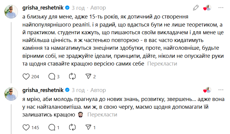 “Я радий, що вдається бути не лише теоретиком, а й практиком. Студенти кажуть, що пишаються своїм викладачем і для мене це найбільша цінність. Я ж частенько повторюю – в вас часто кидатимуть каміння та намагатимуться знецінити здобутки, проте, найголовніше, будьте вірними собі, не зраджуйте ідеали, принципи, дійте, ніколи не опускайте руки та щодня ставайте кращою версією самих себе”, – наголосив Григорій.