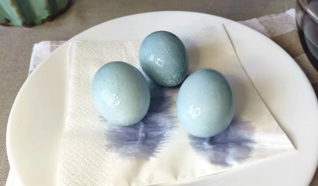 Процідіть відвар і дайте йому охолонути впродовж 10 хвилин, потім покладіть 3 зварених яйця і залиште на 30 хвилин. Потім дістаньте їх і викладіть на серветку. Вони мають вийти ніжно голубого кольору.