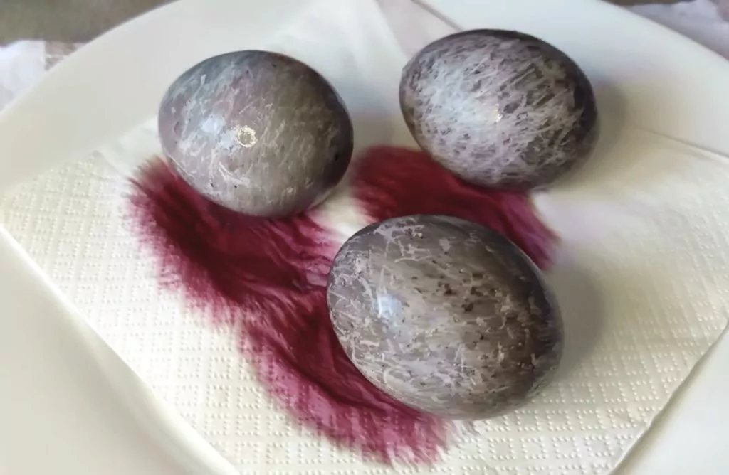 Фарба для великодніх яєць виготовляється з різних продуктів з комори: буряк – рожевий або червоний, червона капуста – синій, куркума – жовтий.