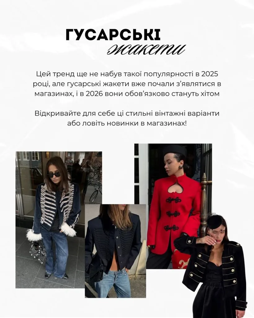 Один із найяскравіших трендів 2026 року – гусарські жакети. Хоча у 2025-му вони ще не стали масовими, ці моделі вже з’являються в колекціях і магазинах.