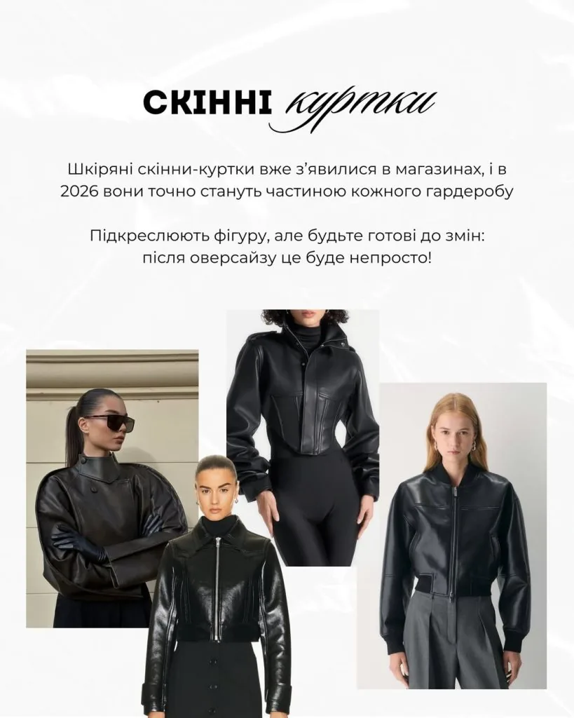 Ще одна тенденція – повернення обтислих силуетів. Шкіряні скінні-куртки вже активно з’являються у продажу та поступово витісняють оверсайз.