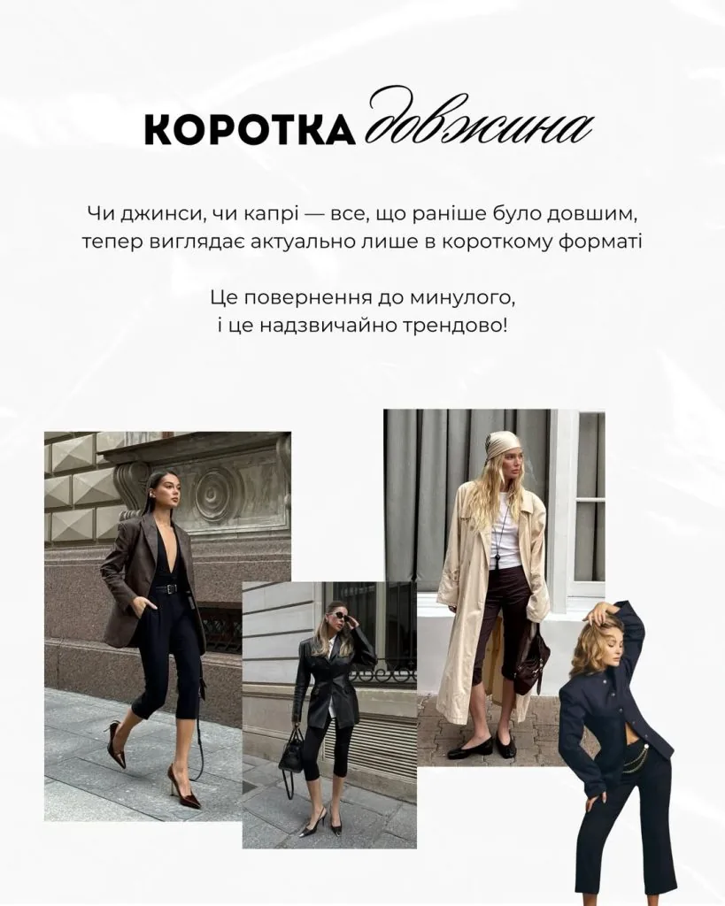 Мода знову звертається до минулого – актуальності набуває коротка довжина. Джинси, штани, капрі та навіть спідниці, які раніше були довшими, у 2026 році виглядатимуть трендово саме в укороченому форматі.