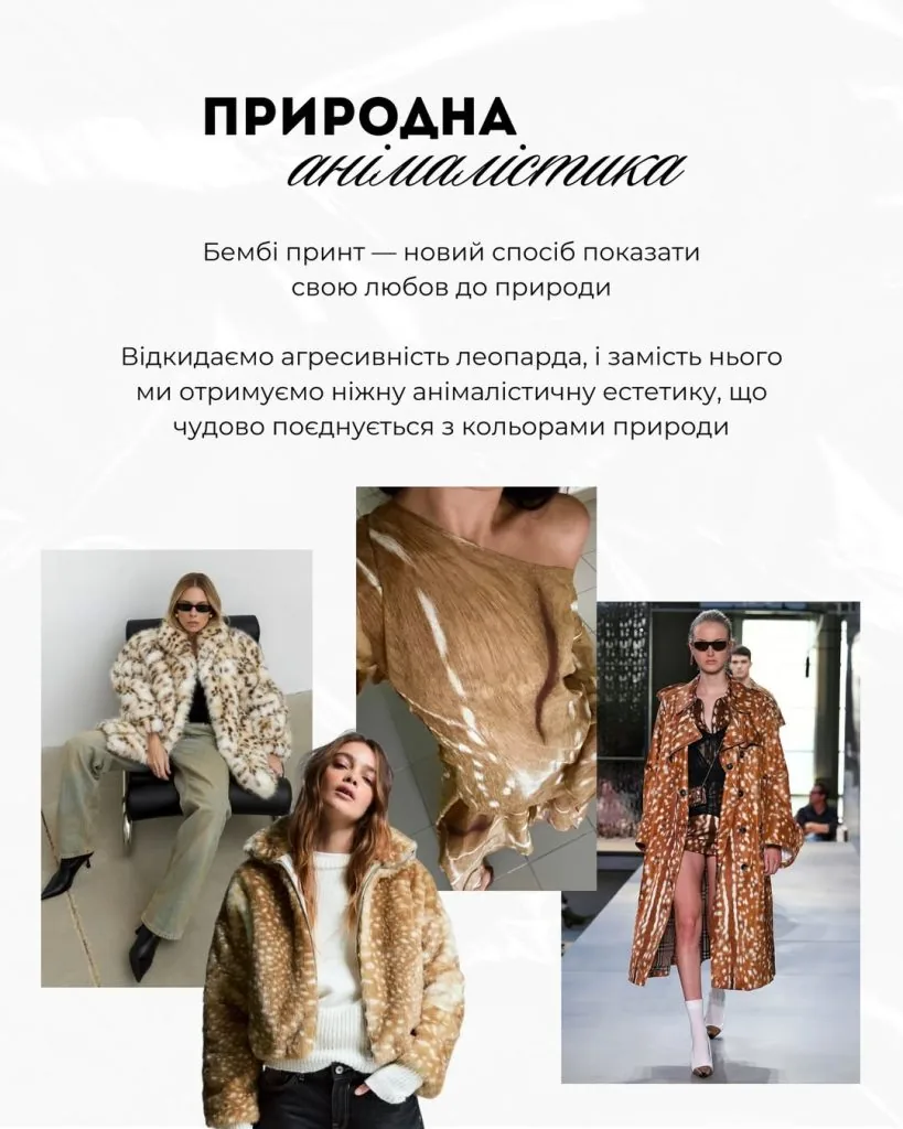 Так званий “бембі-принт” стає новим способом показати любов до природи, гармонійно поєднуючись із природними відтінками та спокійними текстурами.