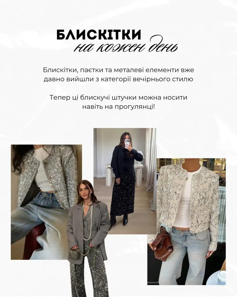 Блискучі елементи остаточно вийшли за межі вечірньої моди. Лелітки, металізовані тканини та блискітки тепер доречні навіть у повсякденних образах – на прогулянці чи в міському ритмі.