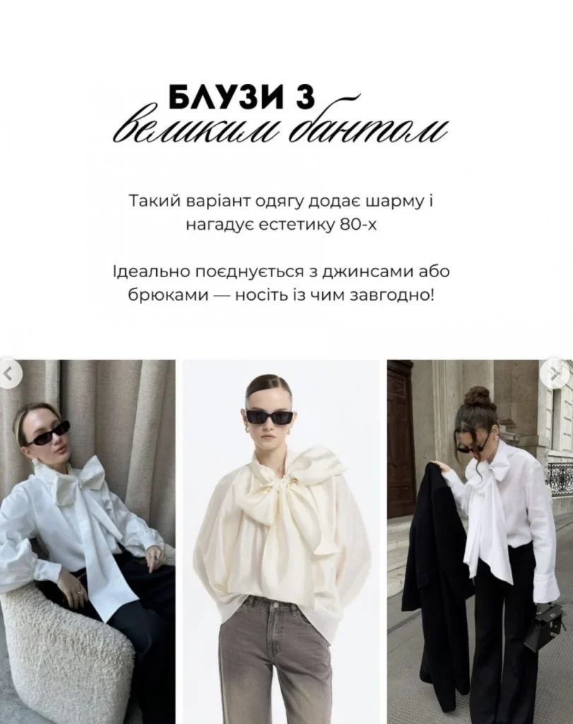 Моделі з великим бантом чудово поєднуються з джинсами та класичними брюками, створюючи романтичний і стильний образ.