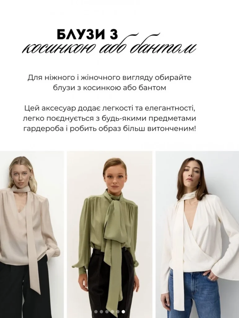 «Блузки — головний тренд цієї весни. Жіночність зараз у центрі уваги, тому ці елементи гардеробу будуть всюди. Гортайте добірку та обирайте свій ідеальний варіант», — зазначив дизайнер.