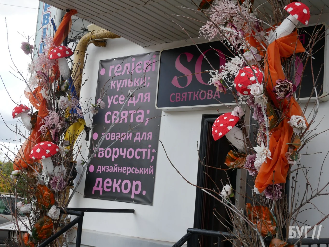 Магазини прикрашені осінніми декораціями — гарбузами, грибами, гірляндами з листя. У вітринах — теплі светри й пальта, у повітрі — аромат кориці й кави.