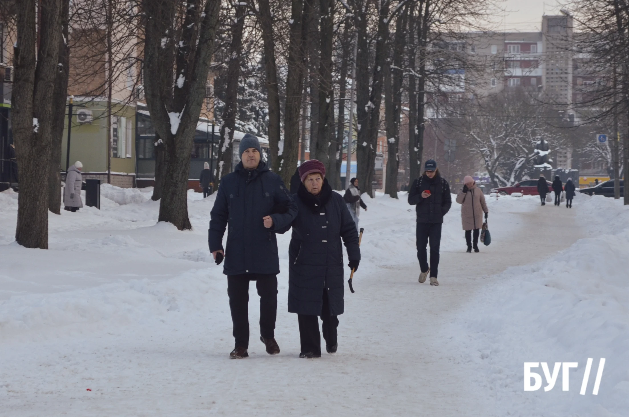 Зранку видно свіжі сліди від лопат, розчищені проходи, сніг зібраний обабіч тротуарів. Дехто розчищає прохід біля свого двору чи під’їзду, Хтось поспішає йдучи повз, переступаючи через замерзлі грудки снігу.