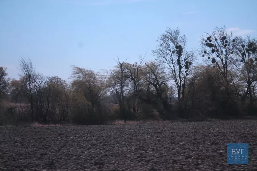 На фото видно, як дерева протистоять поривам вітру, оберігаючи поля від буревію, який супроводжується процесом дефляції, тобто вітровою ерозією грунту: часточки родючого шару землі вітер може переносити в залежності від його складу.