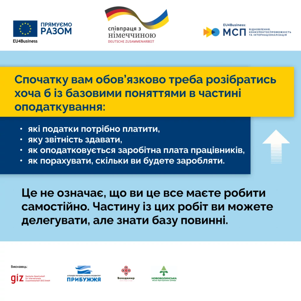 — Якщо ви вирішили почати власну справу, то вам обов’язково потрібно розібратися хоча б з базовими поняттями в частині оподаткування: які податки потрібно платити, яку звітність здавати, як оподатковується заробітна плата працівників, як порахувати, скільки ви будете заробляти. Це не означає, що все це треба робити самостійно – частину з таких робіт ви можете делегувати, але знати базу повинні.