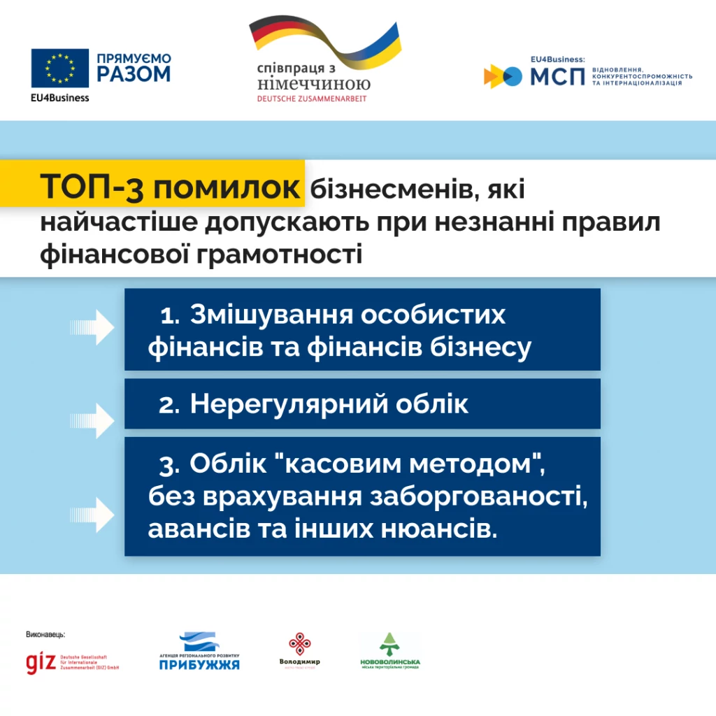 — Є три основні помилки. Перша – змішування особистих фінансів та фінансів бізнесу. Друга – нерегулярний облік. Третя – облік «касовим методом», без урахування авансів, заборгованостей та інших нюансів.