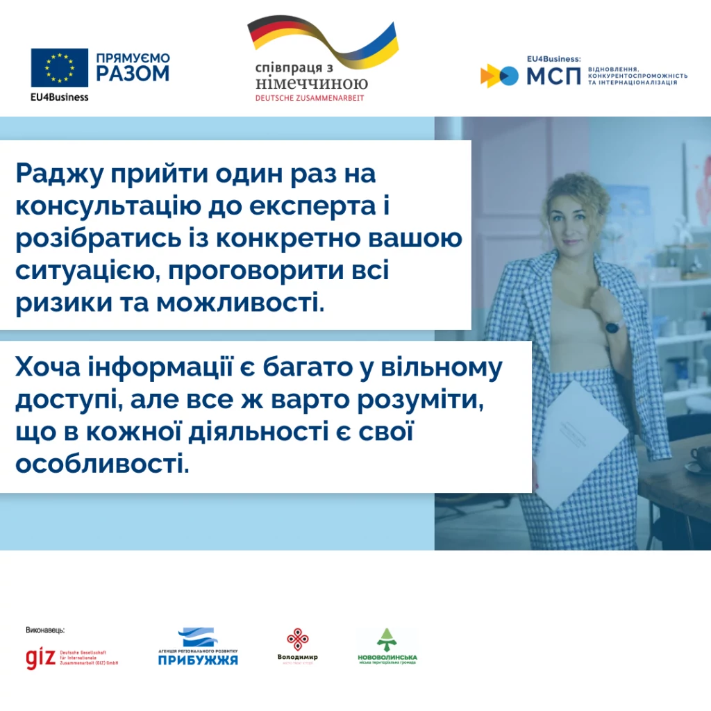 — Тут ми зазвичай радимо не вдаватися до безкоштовних пошукових сайтів, а прийти один раз на консультацію до експерта й розібратися з конкретно вашою ситуацією, проговорити всі ризики та можливості. Хоча інформації є багато у вільному доступі, але все ж варто розуміти, що в кожної діяльності є свої особливості. І якщо для вас це все нове, то не потрібно вивчати все законодавство, краще прийти й отримати інформацію, яка стосуватиметься конкретно вашої справи.
