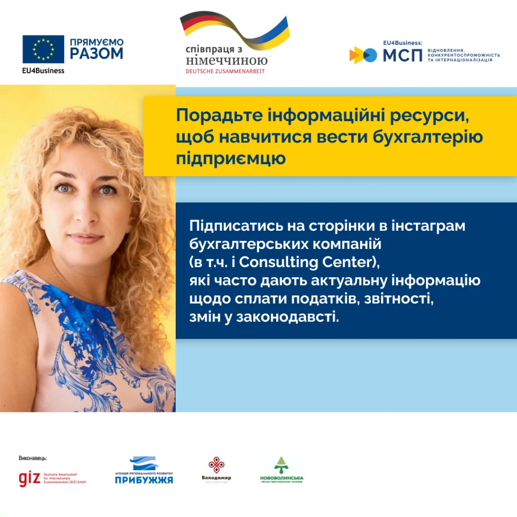 — Тут можна порадити підписатися на сторінки в інстаграм бухгалтерських компаній (зокрема й Consulting Center), які часто дають актуальну інформацію щодо сплати податків, звітності, змін у законодавстві.