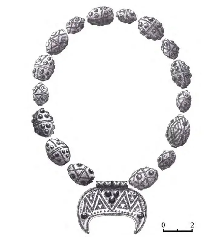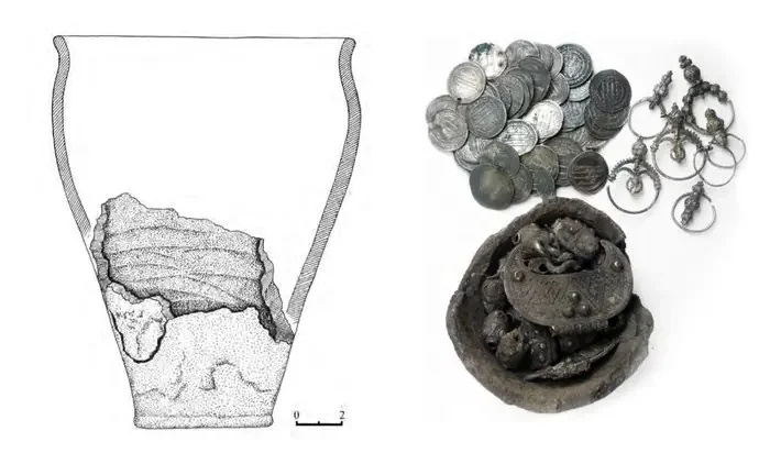 Усього дослідники вивчили 70 срібних монет, шість сережок, шістнадцять овальних срібних намистин та інші елементи оздоблення.