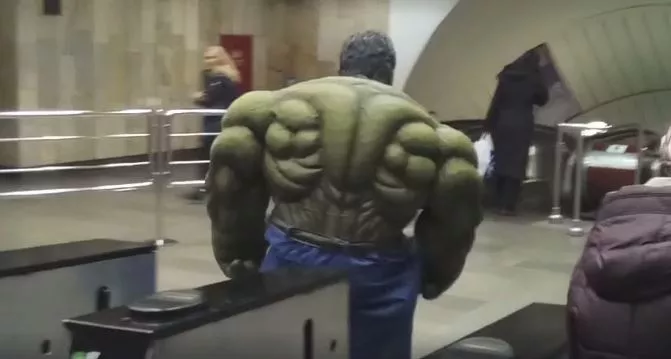 У Києві невідомий в зеленому костюмі Халка пройшовся в метро. Відео з «Халком» опублікував блогер Олександр Барабошко у Facebook. Він спокійно купує в касах підземки собі жетон. Інші пасажири здивовано зустріли «Халка» і навіть розступалися, щоб пропустити велетня. Зрештою зелений супергерой, ледве протиснувшись ...