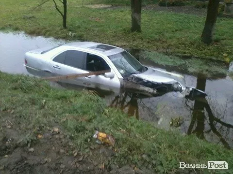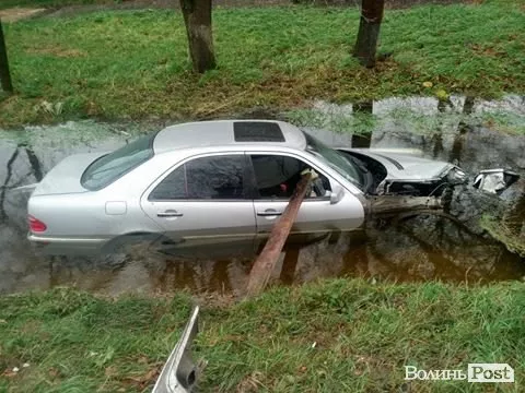 На Волині сталася аварія, під час якої автомобіль Mercedes збив стовп та злетів у канал з водою.