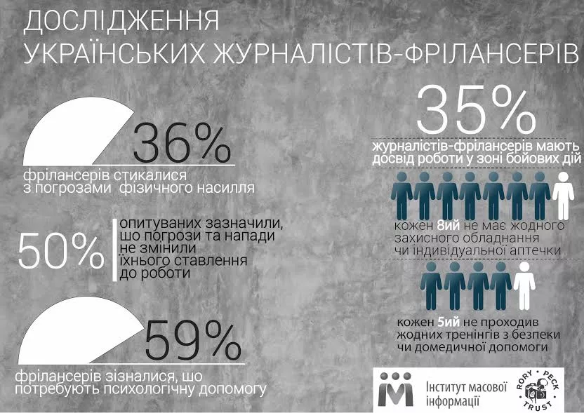 Такими є результати анонімного опитування українських журналістів-фрілансерів, проведеного британським фондом Rory Peck Trust спільно з ГО Інститутом масової інформації, за підтримки Фонду демократії ООН, у лютому 2017 року.*