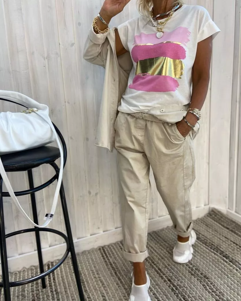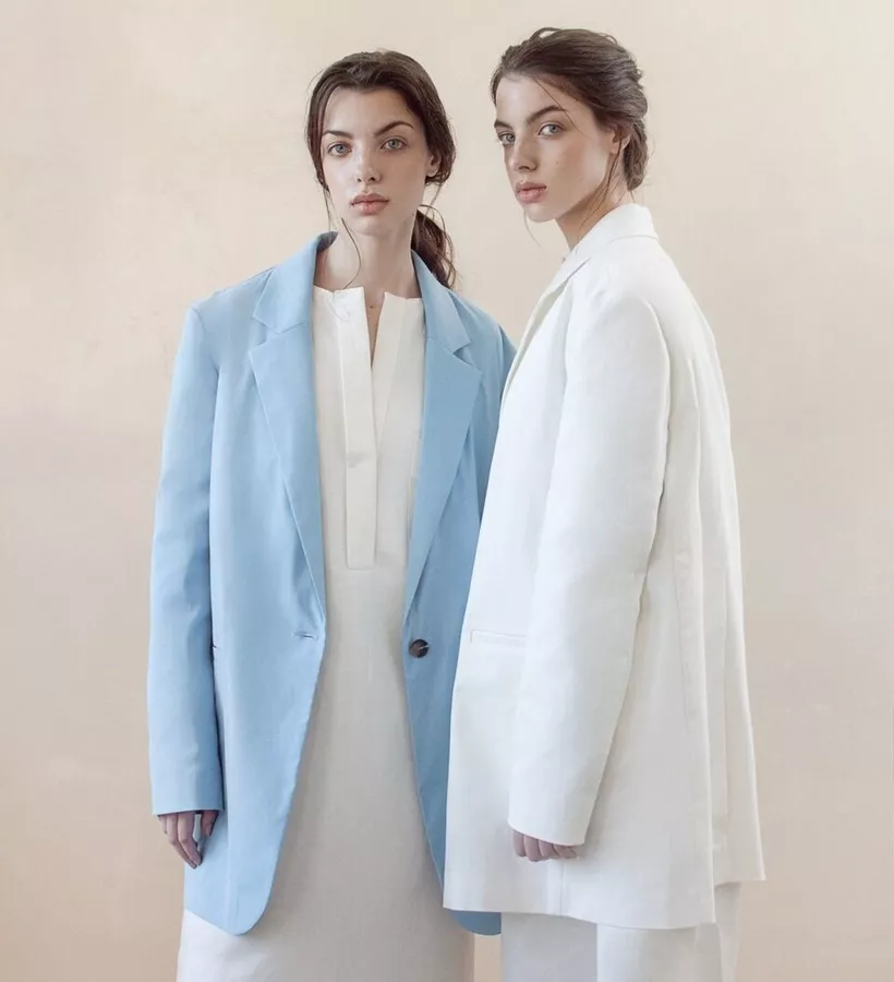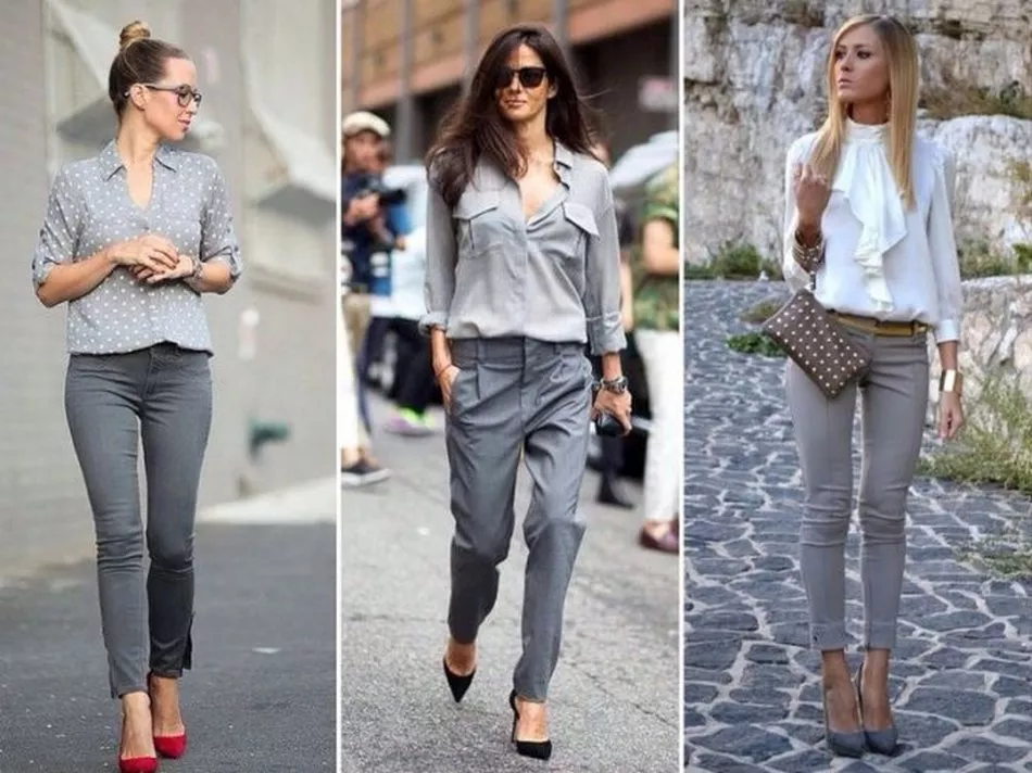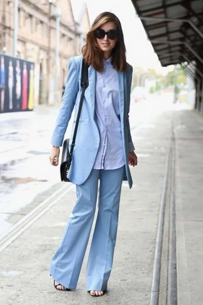 Для робочих буднів, якщо у вас в офісі немає строгого дрес-коду, підійде лук, що складається із легкого піджака оверсайз небесно-блакитного відтінку, сірих бавовняних штанів і білої майки.