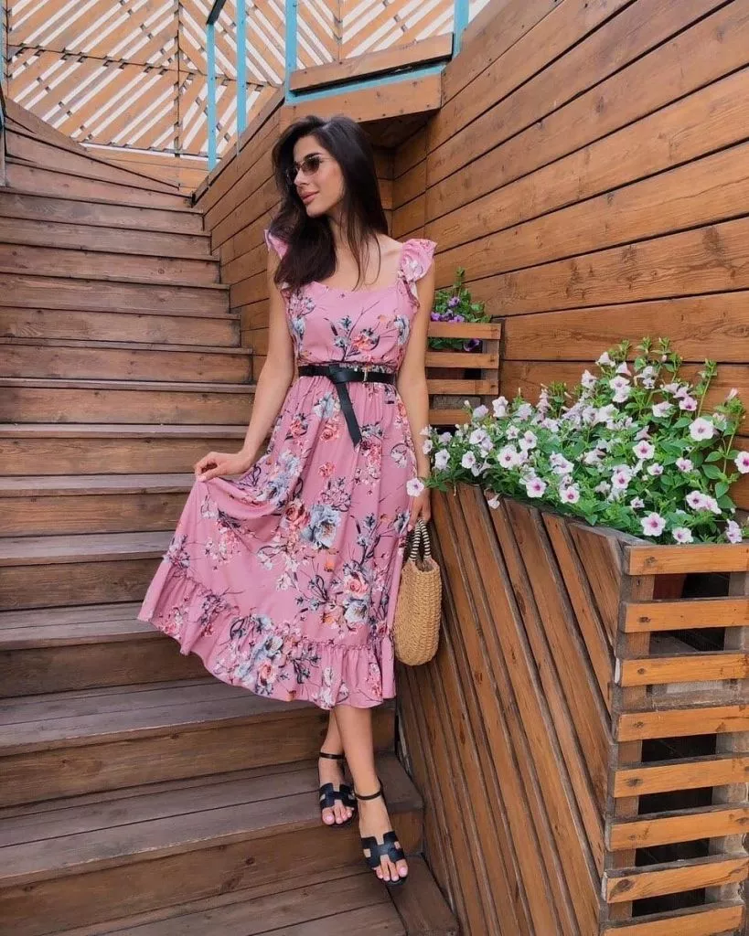 Ще одна річ, яка точно повинна бути в літньому гардеробі кожної дівчини, – яскравий сарафан із квітковим принтом. Підберіть під нього пояс контрастного кольору – так ви зможете візуально підкреслити талію, а також босоніжки на плоскому ходу в тон до поясу. Доповніть лук солом’яними капелюхом і сумкою.