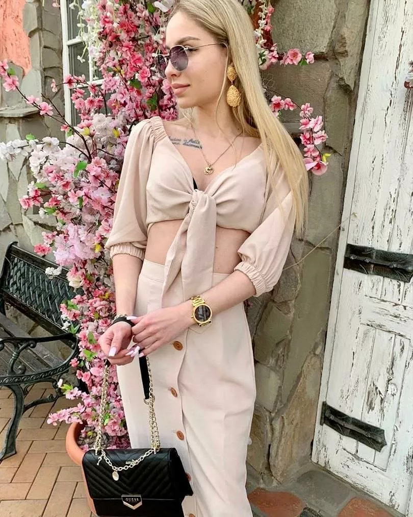 Для романтичного побачення підійде стильний бежевий костюм із льону. Одягайте топ з рукавами три чверті, який зав’язується на вузол, і спідницю максі з високою посадкою, декоровану гудзиками по всій довжині та воланом внизу. Урізноманітніть свій лук елегантним ланцюжком із кулоном, сонцезахисними окулярами, невеликою чорною сумкою і взуттям на високих підборах.