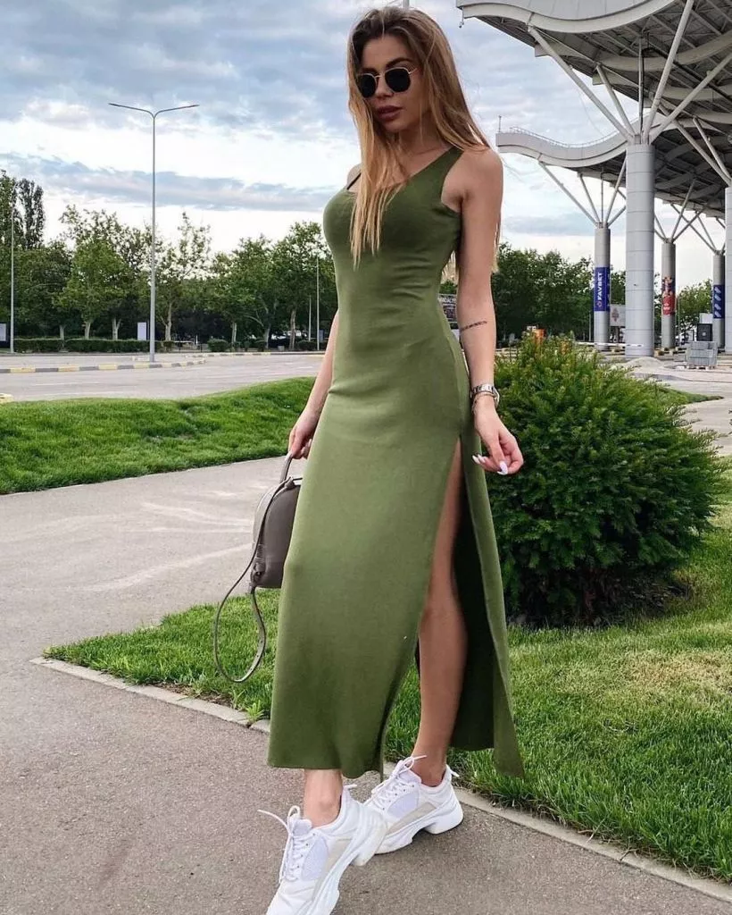 А для прогулянки з друзями або походу на шопінг обирайте зручне трикотажне плаття максі насиченого темно-зеленого відтінку з екстремальними розрізами, які вигідно підкреслять ноги. Доповнять лук білі кросівки на масивній підошві та сумочка-клатч через плече.