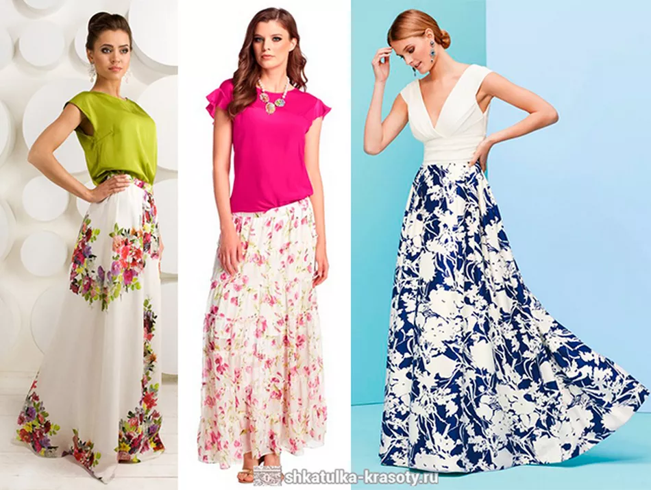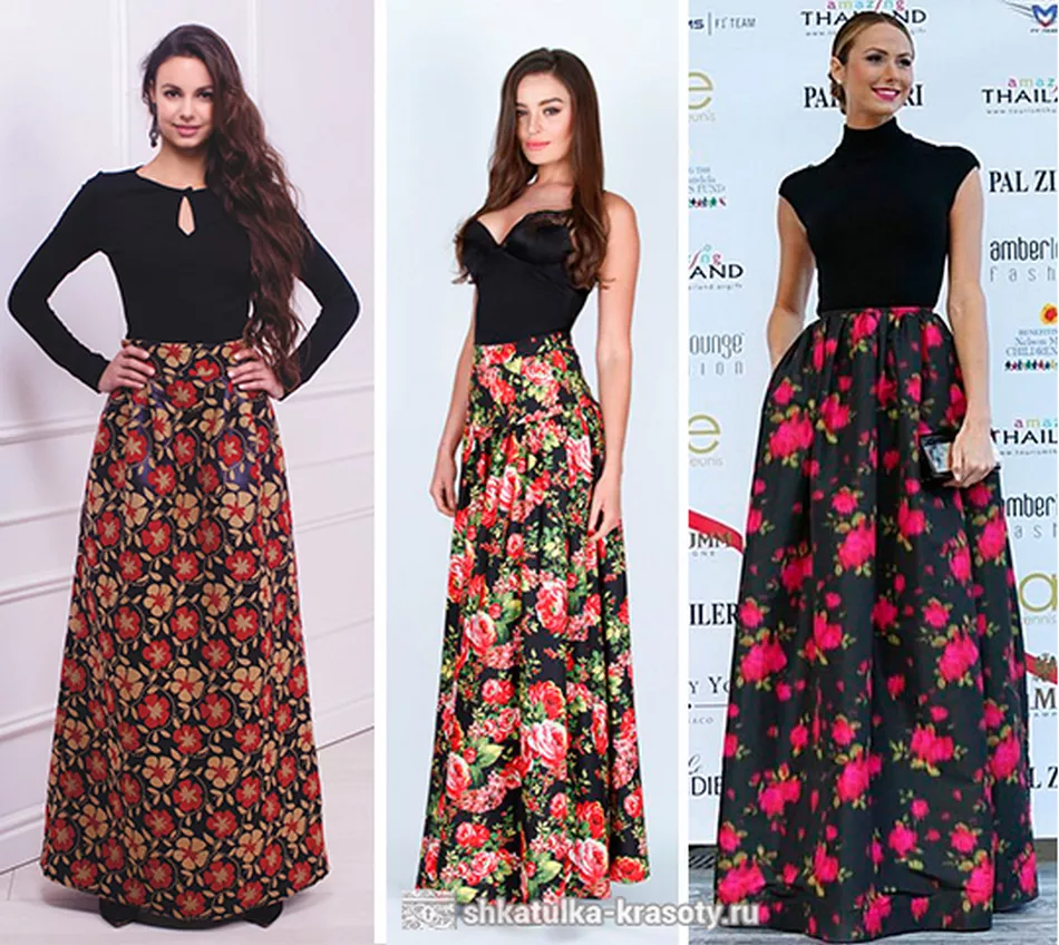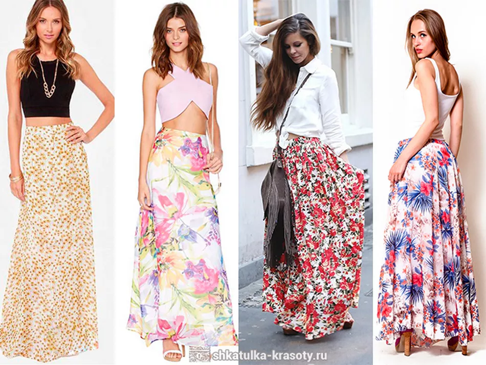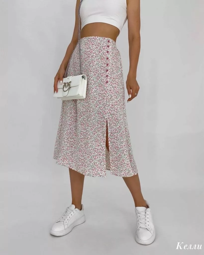 Ще один стильний лук – для свята або виходу на світський захід. Одягайте шифонову спідницю міді в дрібну квіточку, однотонний атласний топ, а зверху укорочений жакет, або як його ще називають кроп-жакет. Доповніть образ босоніжками на високих підборах і маленькою сумкою в тон.