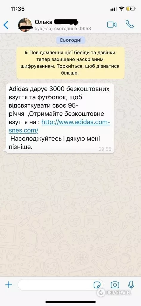 Користувачі Viber та WhatsApp масово поширюють фейкову акцію нібито від всесвітньо відомого бренду Adidas. Що отримати безкоштовні кросівки та футболки, необхідно перейти за посиланням. Однак, за вказаним URL – сайт, який здатний вкрасти особисту інформацію й паролі.
