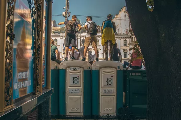Так, багато глядачів розмістилися на деревах, балконах, на смітниках і навіть на біотуалетах. Люди займали всі височини, щоб своїми очима побачити, як 250 одиниць військової техніки проїде головною вулицею міста на честь великого свята.