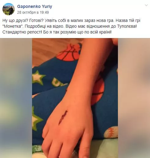 Як йдеться в сюжеті, житель Києва Юрій Гапоненко помітив рани на руках у 12-річного племінника, і той зізнався, що гра “Монетка” поширилася на всю Україну.