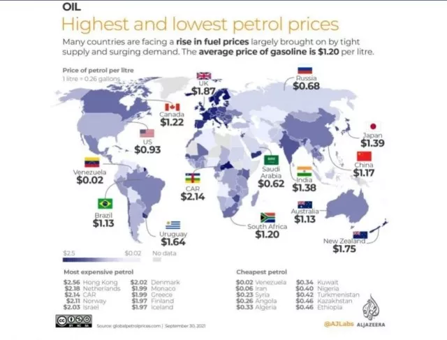 Цікаво, що українські ціни на бензин практично дорівнюють середнім у світі. Так, за даними Aljazeera, в 2001 році середньосвітова ціна літра пального була 0,6 долара за літр, а в 2021-му – 1,2 долара.