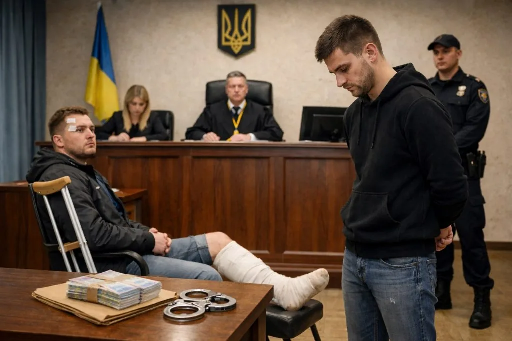 Як йдеться у матеріалах справи, близько 00:50 год. 8-го березня 2021-го року обвинувачений, перебуваючи на території ТРЦ «Княгині Ольги», під час конфлікту із потерпілим умисно завдав йому декілька ударів кулаками по голові, а потім перекинув потерпілого через себе, кинувши на землю. Внаслідок цих дій чоловік отримав закритий перелом правої гомілки зі зміщенням, перелом 8 ребра та інші ушкодження, які суд відніс до середнього ступеня тяжкості.