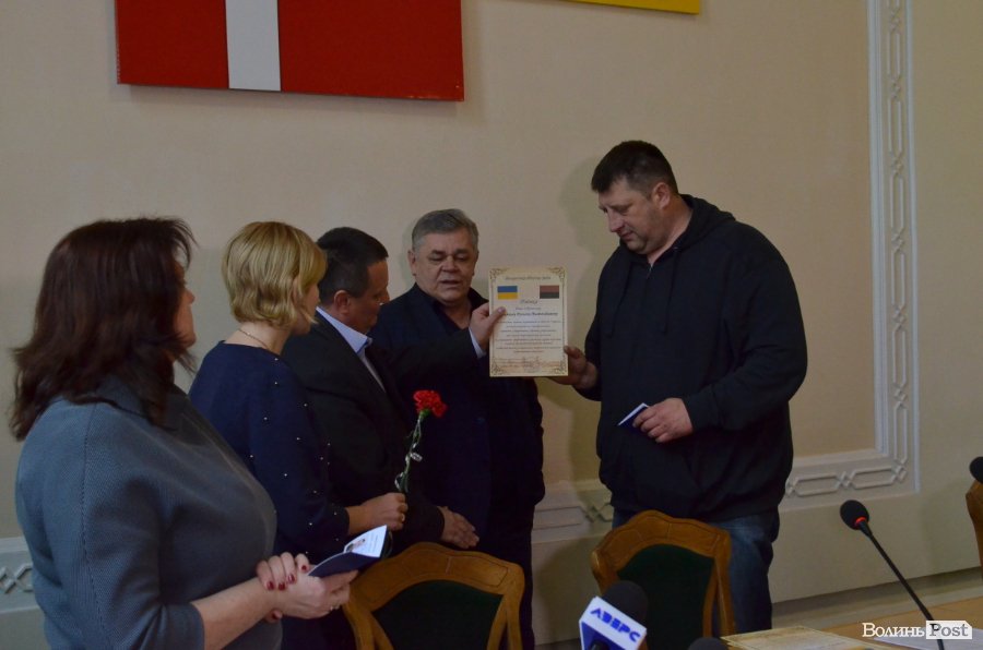 Нині ж у церемонії вручення посвідчень бійцям-добровольцям, окрім Пирожика, також взяли участь голова постійної депутатської комісії обласної ради Анатолій Вітів та директор департаменту соціального захисту Волинської ОДА Оксана Гобод.