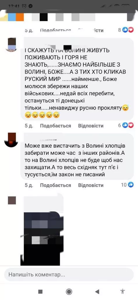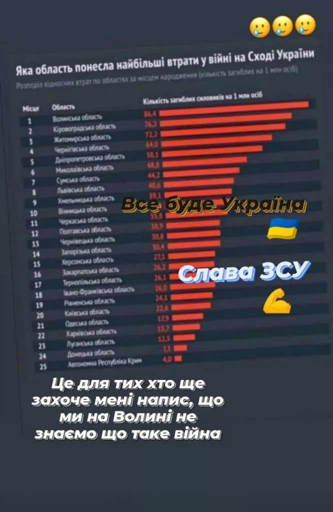 По-друге, ті наративи, які виникають у коментарях до таких публікацій, працюють не на об’єднання країни, яка воює і відстоює свої території, а навпаки. Волиняни, бачачи Київську, Одеську, Харківську та Донецьку області у кінці цього переліку, пишуть гнівні коментарі про те, що Волинь, мовляв, тепер змушена воювати за тих, хто кликав в Україну «рускій мір» тощо. Хоча, нагадаємо, дані інфографіки станом на 2022 рік абсолютно не репрезентативні. Так, для прикладу, Рівненська область, куди щотижня, як і на Волинь, везуть тіла загиблих, у цьому списку – аж на 19 місці.