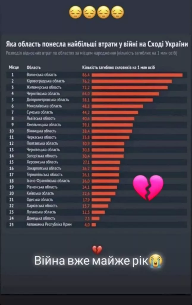 Користувачі соцмереж масово ширять зображення з інфографікою про втрати у розрізі областей України. Але сенс, яким наповнюють волиняни ці повідомлення, додаючи до поширеної картинки власні емоційні тексти, перетворює дані, що раніше були правдивими і актуальними, у маніпуляцію.