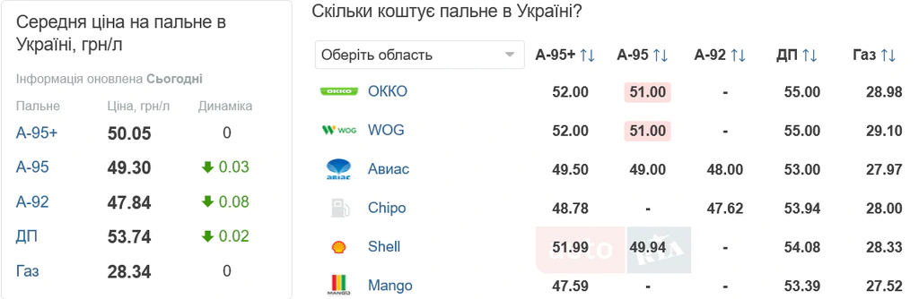 Середня вартість бензину А-95+ в Україні сьогодні становить приблизно 50,05 грн/літр. Бензин А-95 продають в середньому за 49,30 грн/літр, а бензин А-92 – за 47,84 грн/літр. Дизпаливо українці можуть придбати за 53,74 грн/літр, а автогаз – за 28,34 грн/літр. Всі дані можна знайти на порталі Auto.ria: